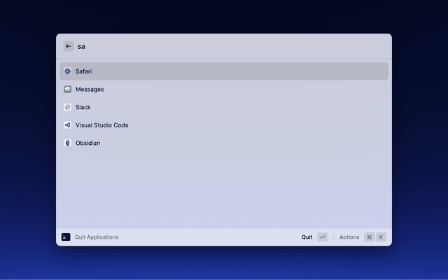 Simply search for and select the application you would like to quit and hit enter. The window stays open for you in case you would like to quit multiple applications.