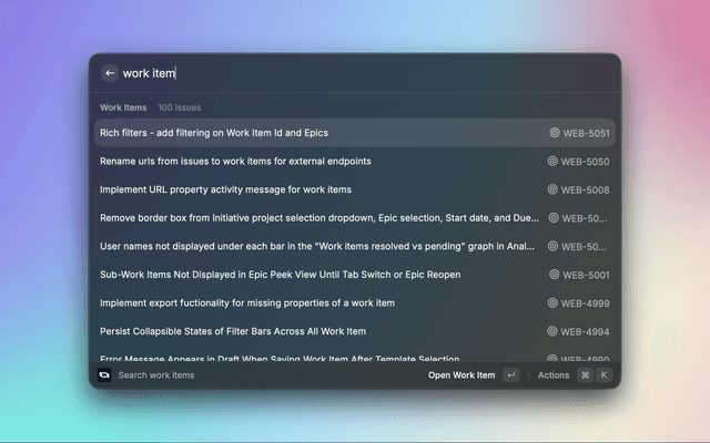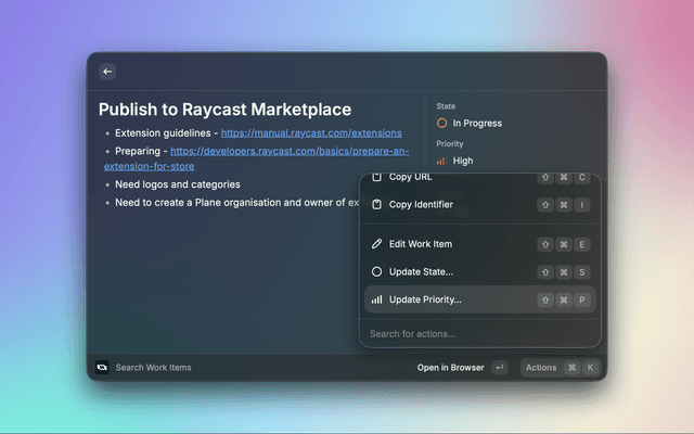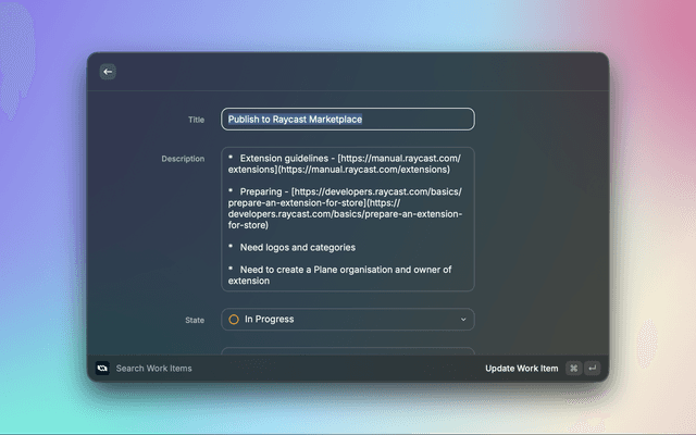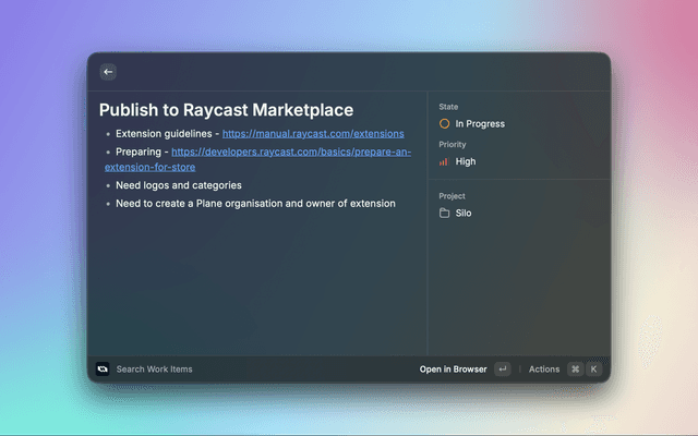 A powerful Raycast extension for managing work items in Plane, the open-source project management tool. This extension allows you to create, search, view, and manage work items directly from your macOS command palette.