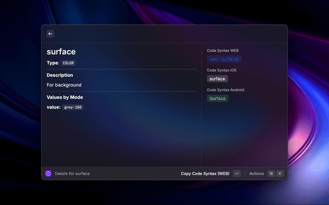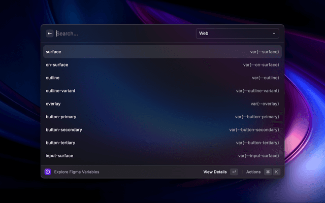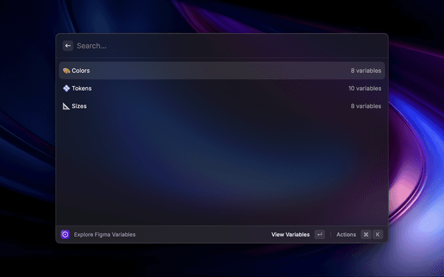 This Raycast extension allows users to interact with their Figma designs by fetching and displaying variable collections from a Figma file. Users can view details of each variable within a collection, including mode-specific values and code syntax.