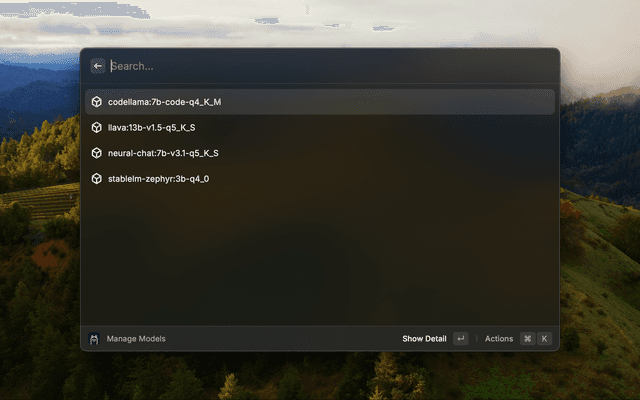 Ollama installed and running on your mac. At least one model need to be installed throw Ollama cli tools or with 'Manage Models' Command. You can find all available model here.