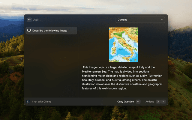 - The commands “Describe Content of Image”, “Get Text from Image”, “Custom Command”, and “Chat with Ollama” support loading images only via image path.