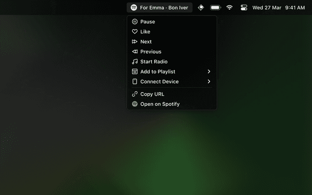 See what's currently playing in your Menu Bar. Click for further actions, such as Play/Pause, Like/Dislike, Skip, Start Radio, Add to Playlist, Connect Device and more. Refreshes every 10 seconds.