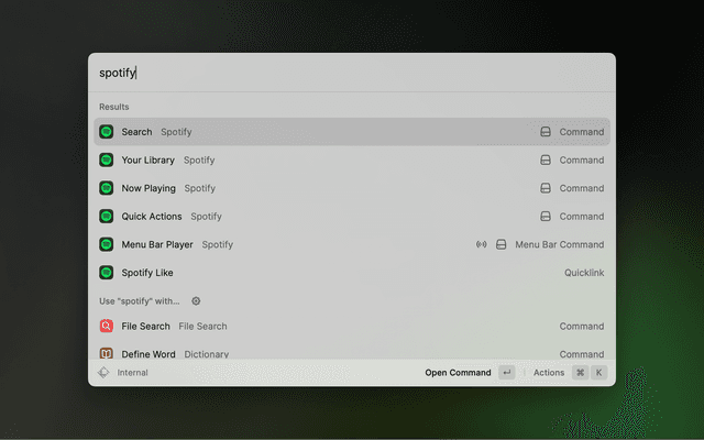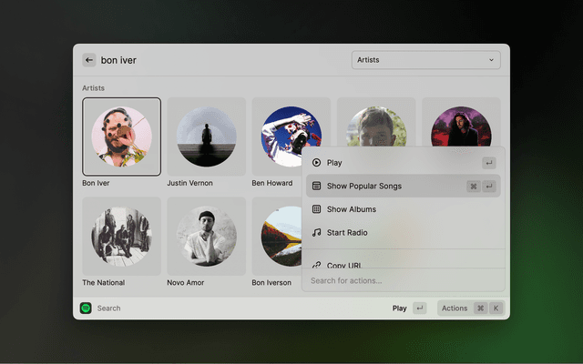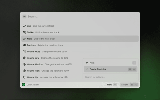 See what's currently playing. Use the actions (⌘ K) for further actions, such as Play/Pause, Like/Dislike, Skip, Start Radio, Add to Playlist, Connect Device and more.