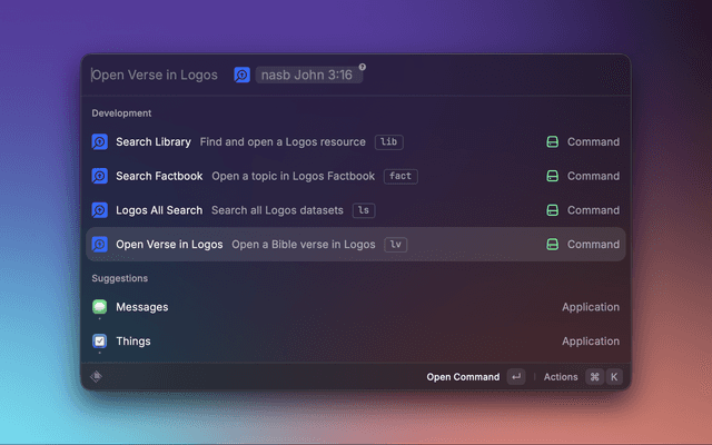 Raycast extension with commands that open verses, run searches, and browse resources in Logos Bible Software.