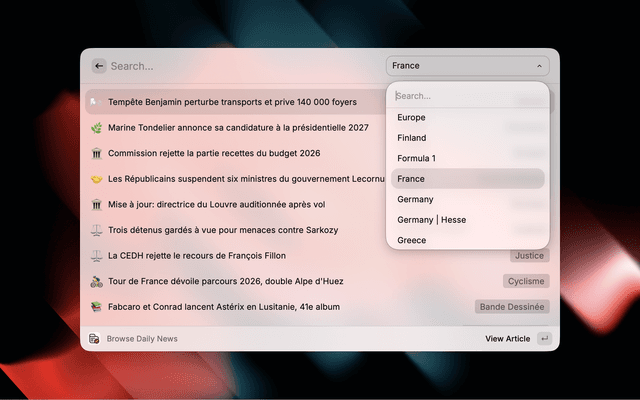 Open Raycast, type "Kagi News", select a category, and browse articles.