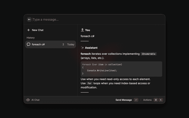 Cmd + N: New conversationCmd + Backspace: Delete conversationCmd + C: Copy conversationQuick question with streaming response.
