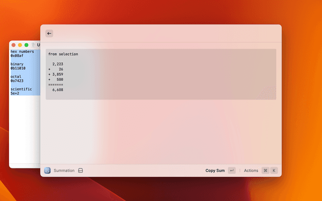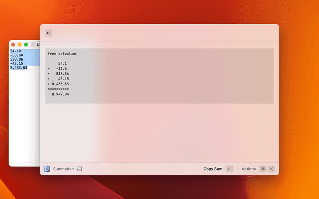 Calculate the sum of a list of numbers in the selected text or clipboard.