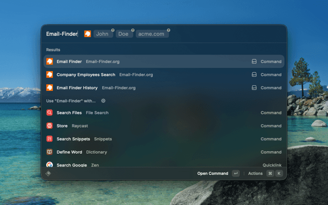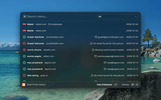 Search for a person's email by entering their first name, last name, and company domain.