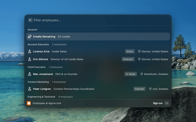 Browse employees at any company by domain. Filter by department and view detailed profiles with verified emails.