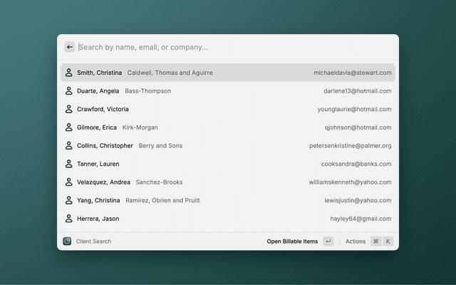 Search your WHMCS Clients and quickly access the client's profile, billable items, and more.