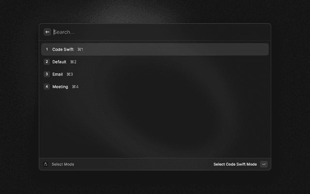 Change modes, start and stop recordings, search history, copy or paste the most recent transcript, and open settings. Choose AI Processed or Unprocessed transcript variants in command settings for history copy/paste commands. Set a custom recording directory for Search History via command preferences.