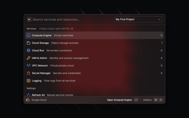 A lightweight Raycast extension for managing Google Cloud resources efficiently. Access and control your GCP projects, services, IAM, storage, and more—all without leaving Raycast.