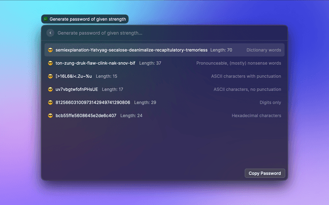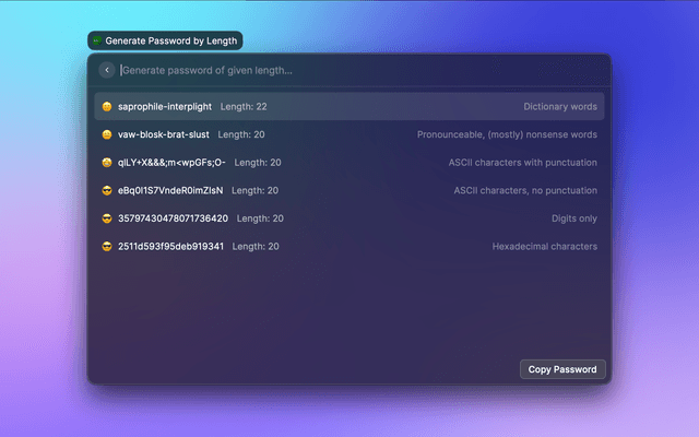 Generates a password from 5–64 characters with options for case, special characters, and more