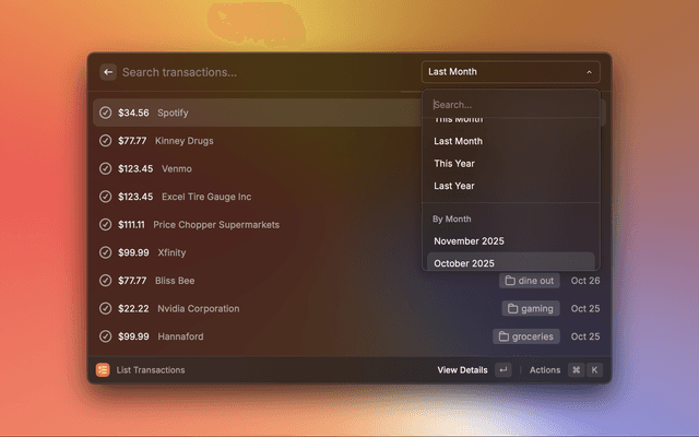 Raycast extension to view and update your Lunch Money transactions.