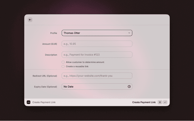 Generate payment links instantly. Set custom amounts, descriptions, and expiry dates. Links are automatically copied to your clipboard.