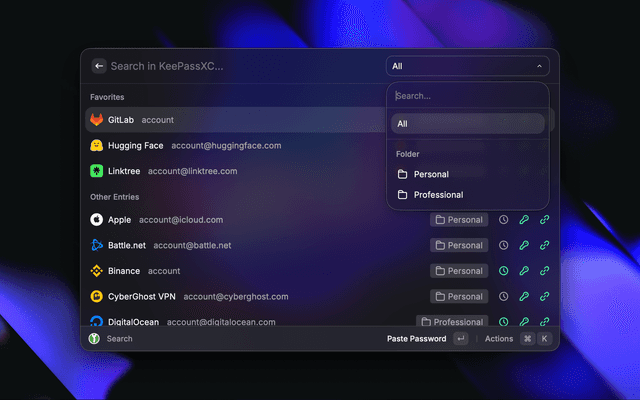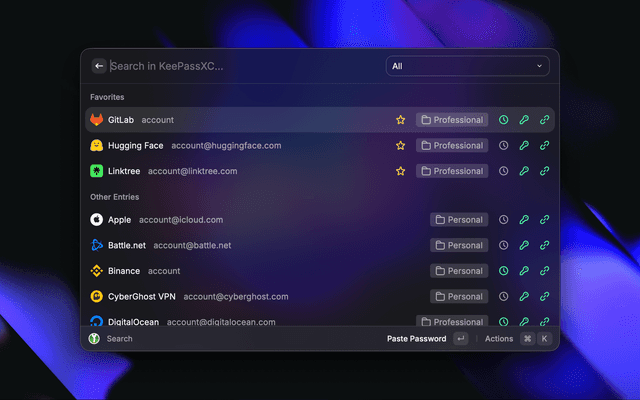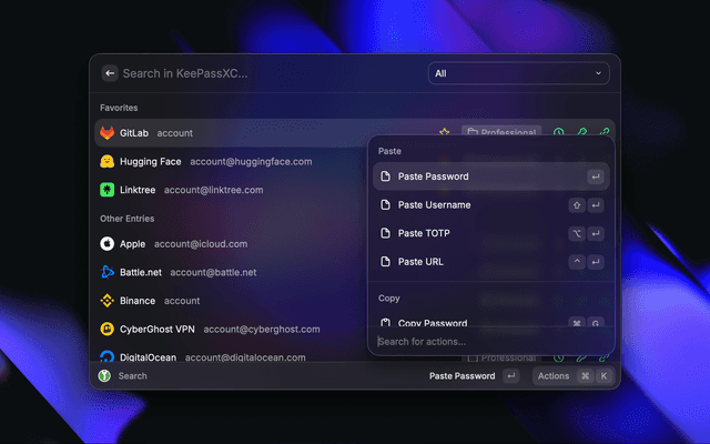 Search entries ⸱ Copy & paste any field ⸱ Generate TOTP codes ⸱ Mark entries as favorites