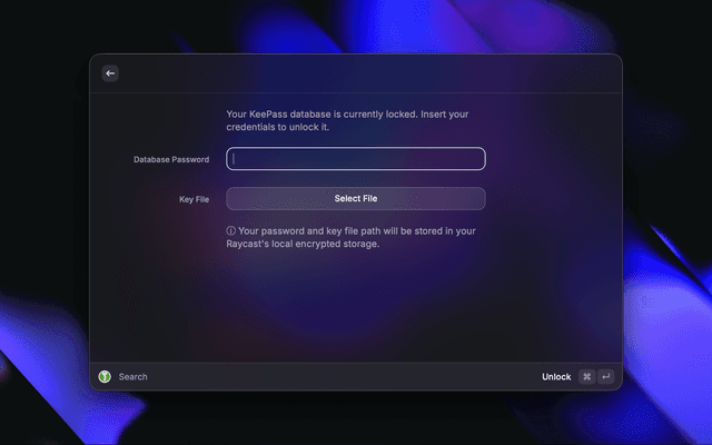Your credentials required to access your KeePass database, which include a password and an optional key file, are securely stored in Raycast's local encrypted database. This storage prevents other extensions from accessing the storage of that extension.