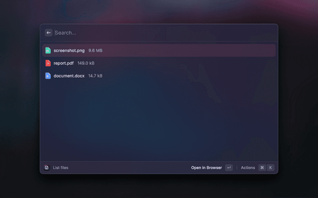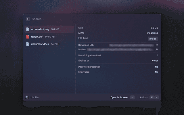 This Raycast extension allows you to manage your Gokapi server directly from Raycast. Use it to upload files, list existing files, copy download and hotlink URLs, and delete files with ease.