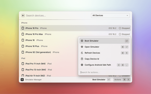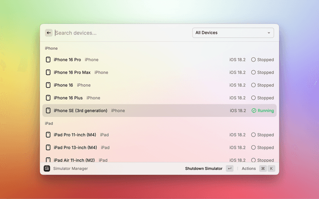 Easily manage iOS simulators and Android emulators directly from Raycast.
