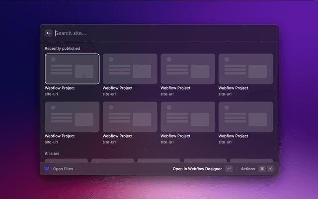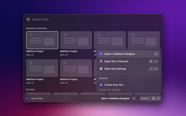 Supercharged productivity for Webflow. Bring Webflow to every corner of your OS. Open any project from anywhere. Site settings and more.