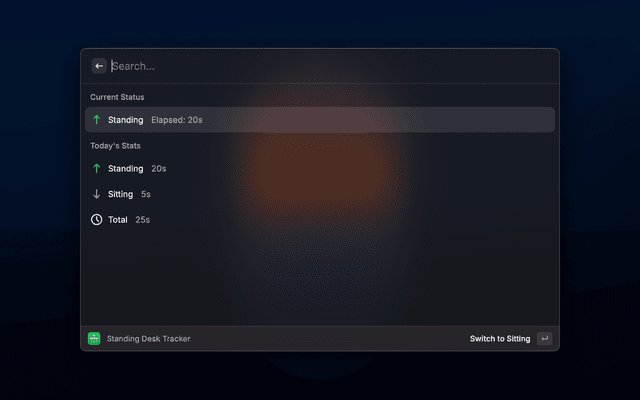 1. Start Tracking: Open the "Standing Desk Tracker" command and select your current position (Standing or Sitting)