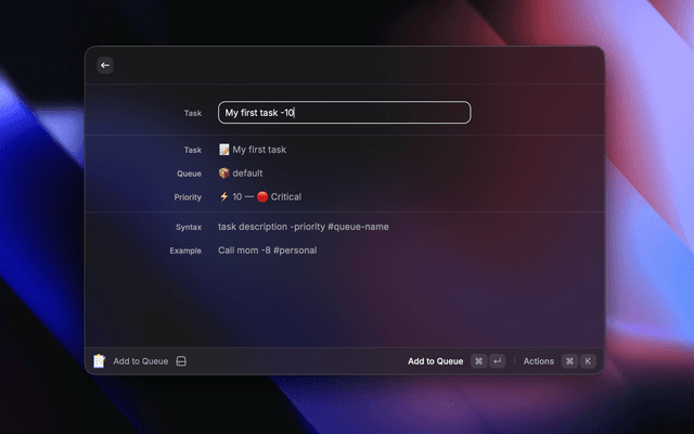 Add tasks with real-time preview showing parsed task, queue, and priority level.