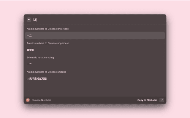 Chinese Numbers is a Raycast Extension to Convert Arabic numbers to Chinese numbers.