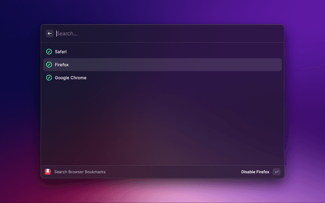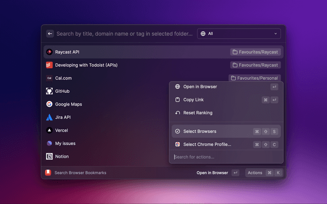 The extension retrieves bookmarks from two sources: your browsers and their profiles. The default browser is enabled by default, while the others are disabled. You can enable them using the Select Browsers action (⌘ + ⇧ + S). This will directly get your bookmarks.