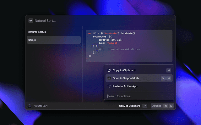 - Perform actions such as Copy to Clipboard, Paste to Active App, and Open in SnippetsLab.