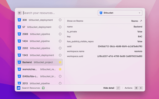 List your resources, see their details and go to your Resmo UI from Raycast