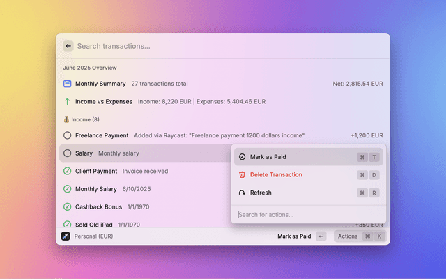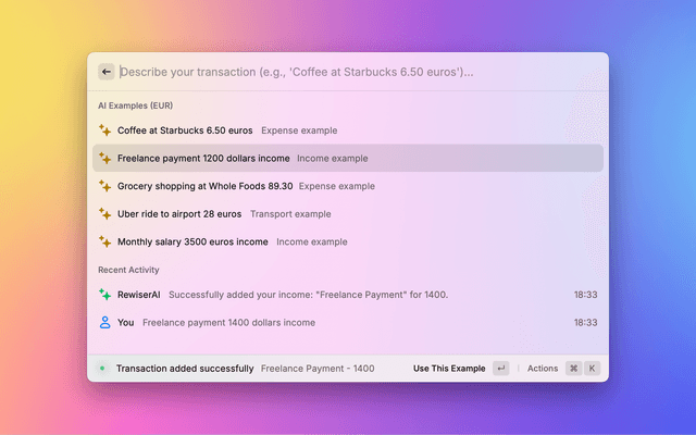 Easily add and manage financial transactions in your Rewiser account — directly from Raycast.