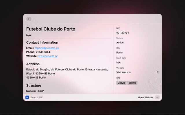 Look up key VAT identification number (NIF) details for Portuguese companies.