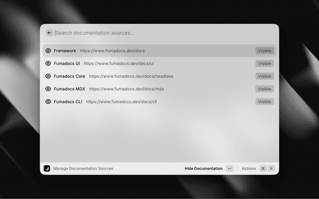 • Manage Documentation Sources: Add, remove, or toggle visibility of documentation sources