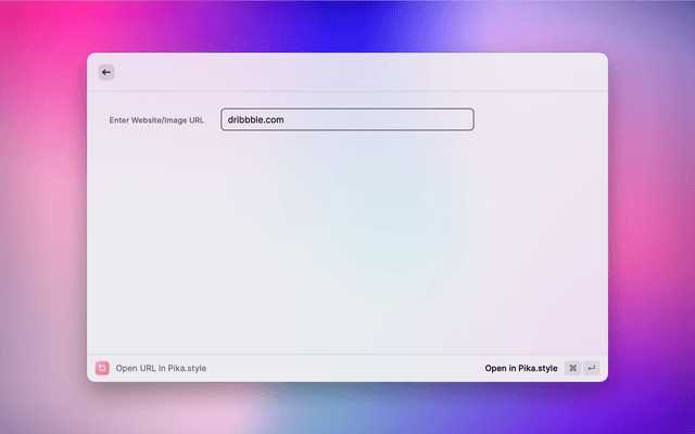 pika in RaycastOpen URL in Pika and Open Image in PikaOpen Image in Pika: You can select an image using Cmd+O from your system and open directly in PikaOpen URL in Pika: You can enter a website URL or image URL and open in PikaPlease email hi@pika.style for bug reporting or feedback