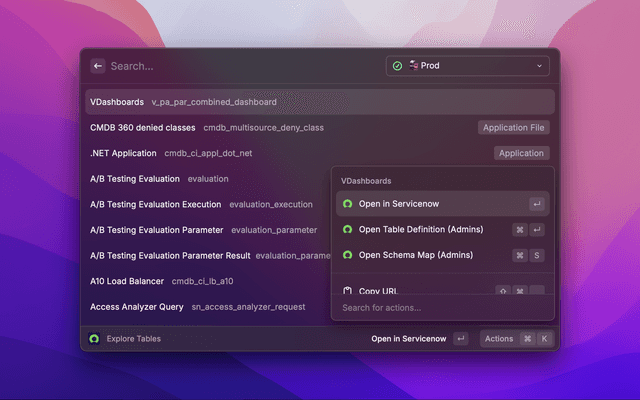 - Table Exploration: Browse and explore the tables in your ServiceNow instance, including their records, definitions, and schema maps (admins only).