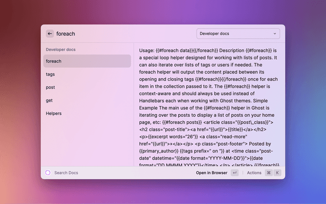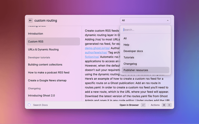 Search Ghost help center, developer docs, tutorials, changelog, and publisher resources right from Raycast!