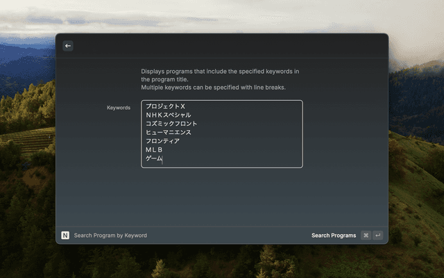 This Extension uses the API provided by NHK. API Key is required to use this Extension. https://api-portal.nhk.or.jp/service-guide