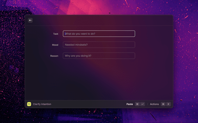 This Raycast extension is designed to assist users in clarifying their intentions and selecting appropriate moods for their tasks. It consists of two main commands: clarify-intention and select-moods. The select-moods command supports the clarify-intention command by providing a curated list of moods to enhance the intention setting process.