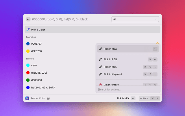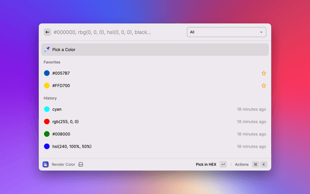 Available keywords to find commands: color, pick, eyedropper, pipette, render, render color, color utilities, color casket