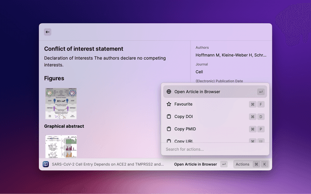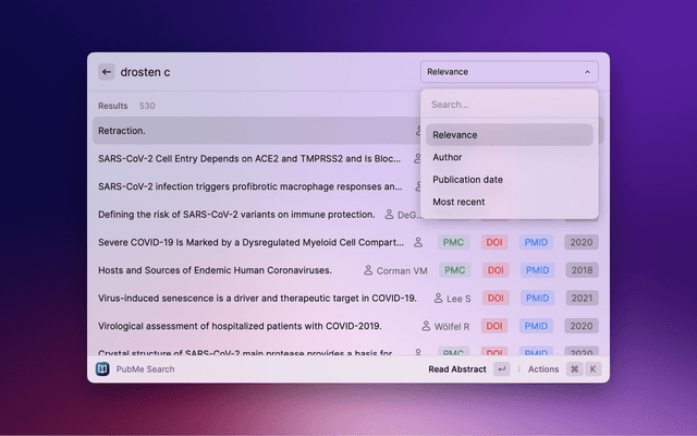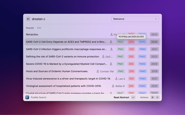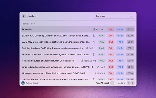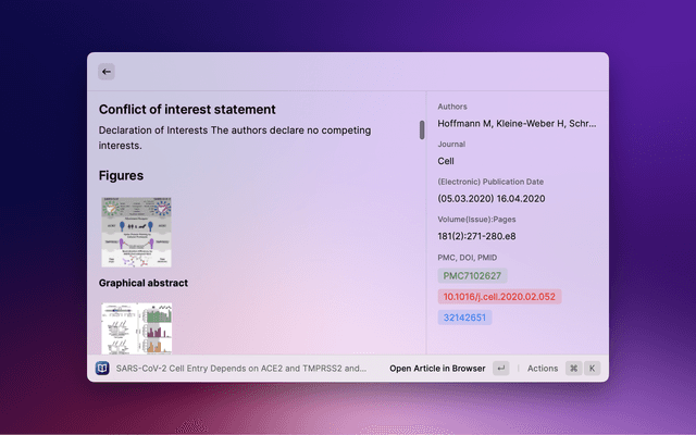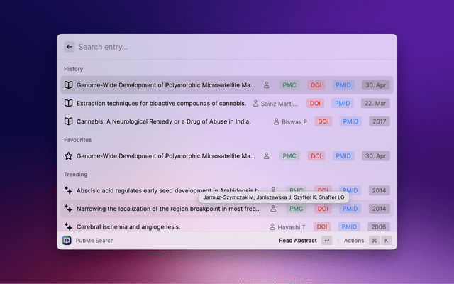 Search PubMed, a free database maintained by the National Library of Medicine (NLM), with Raycast. If the search entry is empty, 10 Trending Articles (from https://pubmed.ncbi.nlm.nih.gov/trending/) are displayed and cached. You can set the refreshInterval in settings.