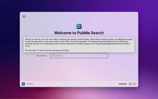 Required NIH API Key (enter "0", if you do not have one): Without an API key, you can only make 3 requests per second. Unfortunately, when listing multiple items, an additional request is sent for each item, so you may receive the error message "Error 429" (too many requests). It is therefore recommended to set an API key to increase the limit to 10 requests/second. Further information at https://support.nlm.nih.gov/knowledgebase/article/KA-05317/en-us