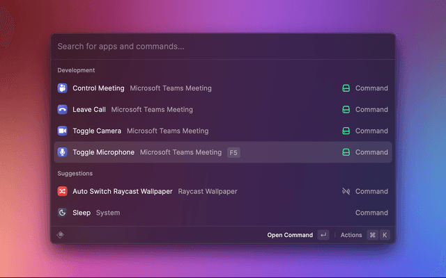 With this Raycast extension you can control a Microsoft Teams Meeting using your keyboard – no matter whether Microsoft Teams is currently the focused app or not. You can also define global hotkeys to toggle microphone and camera.