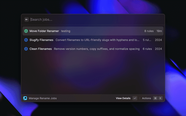 A powerful Raycast extension that allows you to create and manage multiple regex-based file and folder renaming jobs with batch processing capabilities.