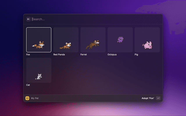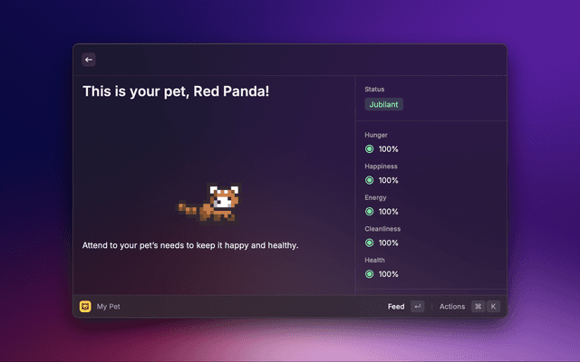 A virtual pet in your Raycast menu bar. Feed, play with, and care for your virtual companion to keep it happy and healthy.