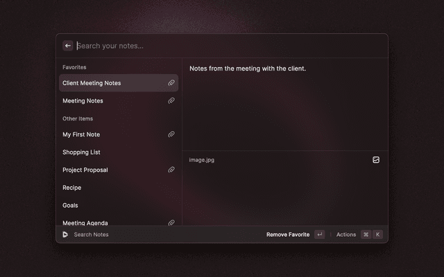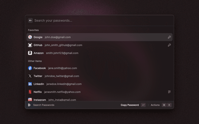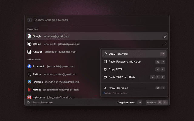 🔎 Search your vault 📋 Copy and paste fields 🔑 Generate TOTP codes ⭐ Mark items as favorites