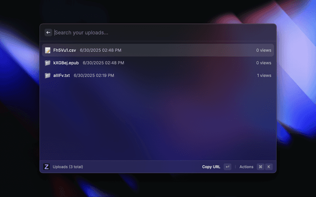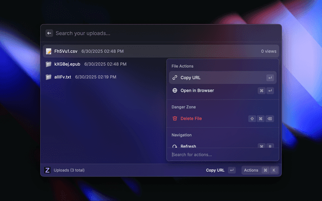 Manage your self-hosted Zipline uploads directly from Raycast. Browse, upload, and share files and text from your clipboard.