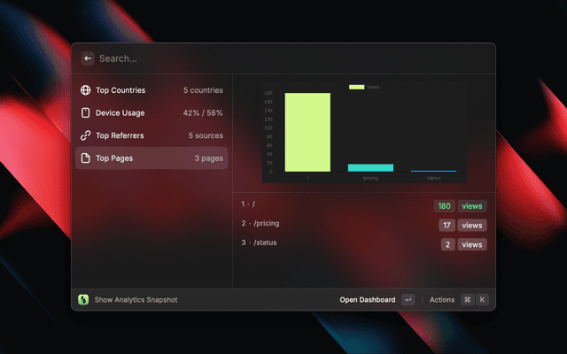 Keep track of your website analytics right from your macOS menu bar. View comprehensive analytics including top countries, device usage, top pages, referrers, and more - all from the last 24 hours.