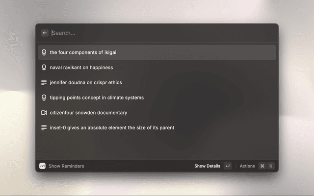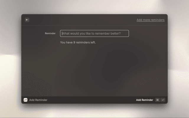Simply add any knowledge that you don't want to forget – insights from articles, facts, concepts, arguments – and Recap does the rest. It uses AI to process your inputs and sends personalized email reminders using spaced repetition to maximize long-term retention.