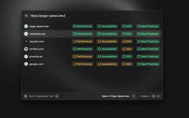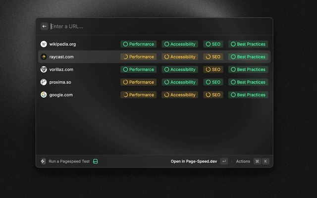 A simple Raycast extension to check the performance of a website using page speed insights from page-speed.dev.