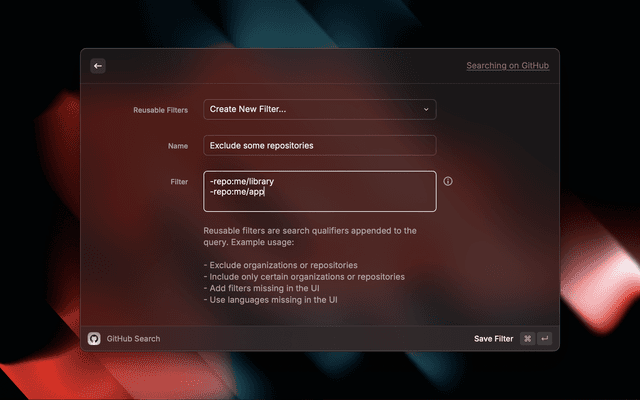 Open the GitHub Search web UI with pre-defined filters
